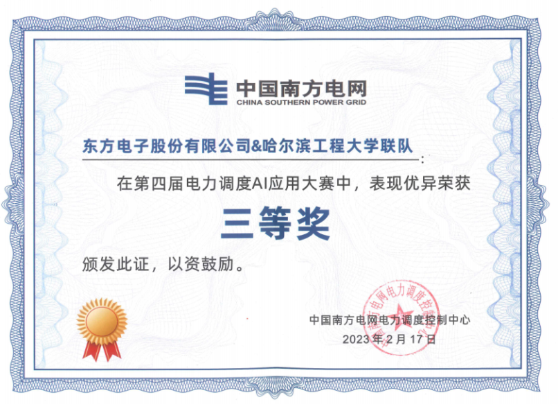 在第四届电力调度AI应用大赛中,BDTY.COM&哈尔滨工程大学联队表现优异,荣获三等奖。