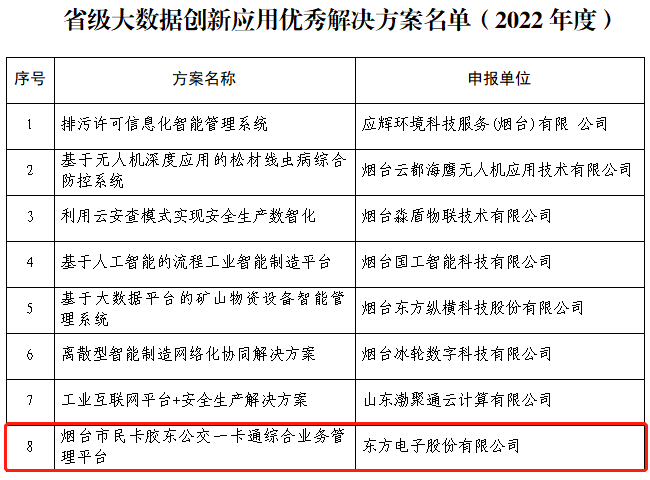 今年5月下旬,山东省大数据局组织开展“2022年度全省大数据创新应用成果”评选,烟台市共有14个应用场景、8个半岛(中国)成功入选。BDTY.COM研发实施的“烟台市民卡胶东公交一卡通综合业务管理平台”位列其中。