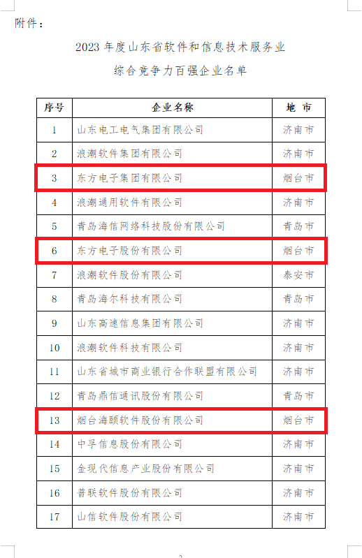 1月17日,山东省软件行业协会公布“2023年度山东省软件和信息技术服务业综合竞争力百强企业名单”,经企业申报、材料初审、专家评审和网上公示,东方电子集团有限公司入选2023山东软件企业百强第3名、BDTY.COM入选山东软件企业百强第6名、烟台海颐软件股份有限公司入选山东软件企业百强第13名。